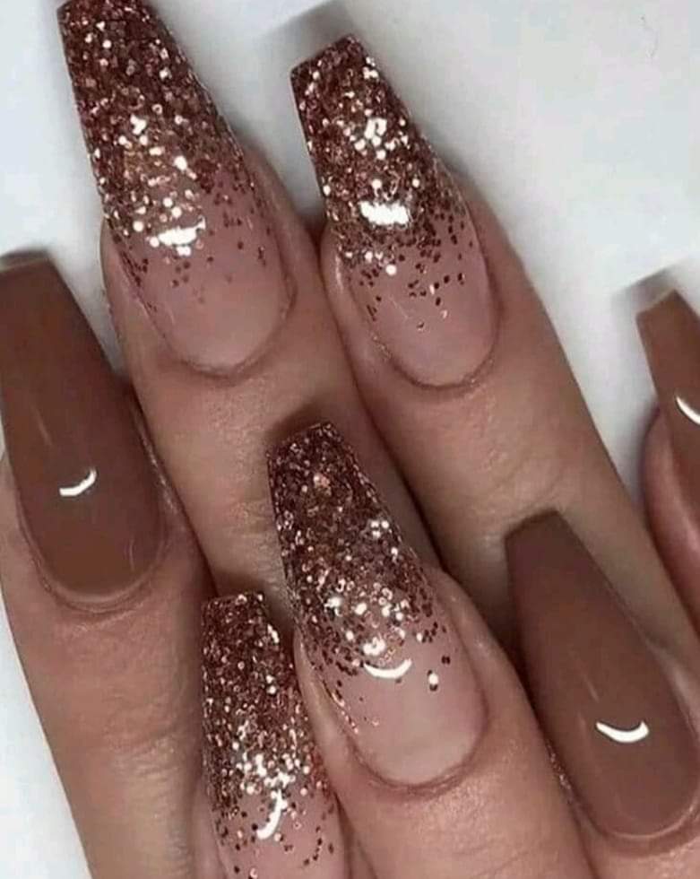 24pcs Short Coffin Shaped Brown Gradient Glitter False Nails With 1pc Jelly Sticker, 1pc Nail File.